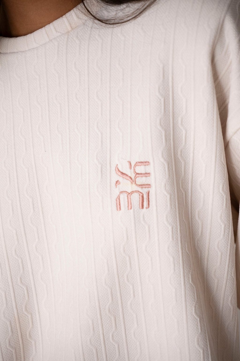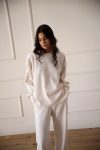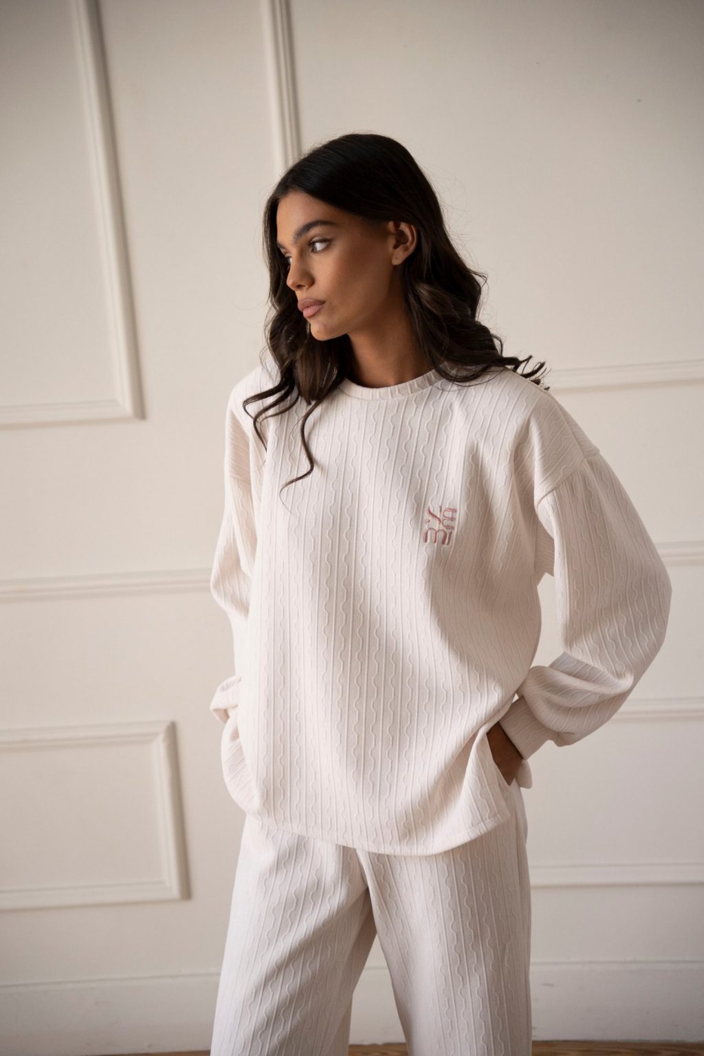 Ένα άνετο,ζεστό και κομψό σετ για να φοράς από το πρωί στη δουλειά σου μέχρι τις βραδινές σου βόλτες.Η μπλούζα με βάτες και κέντημα το logo της εταιρείας σε ροζ αποχρώσεις και μαλακό παντελόνι με λάστιχο στη μέση.To ύφασμα είναι πλεχτό με σχέδιο αλυσίδες για κομψές και άνετες εμφανίσεις.