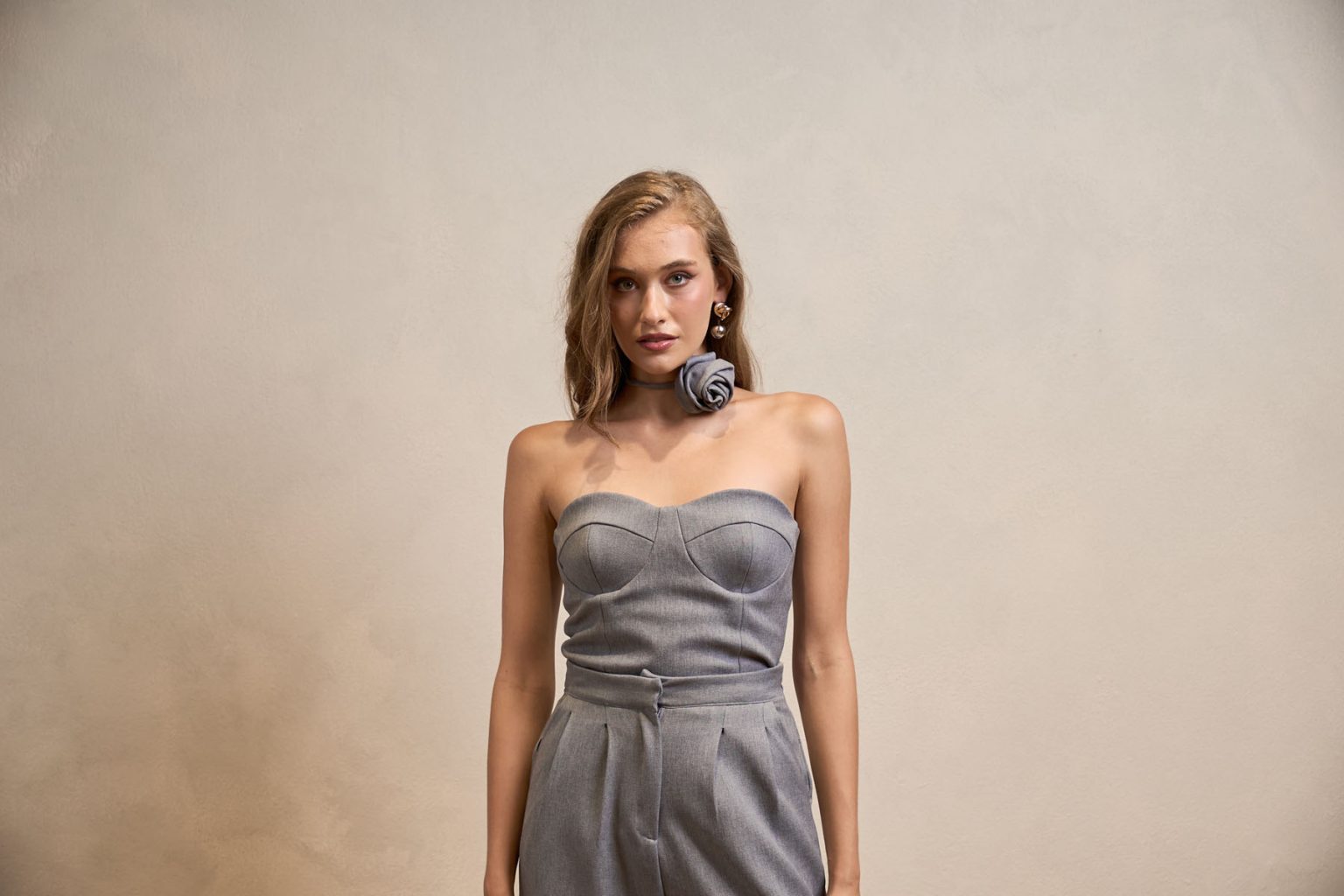 Γκρι κορσές με δέσιμο στην πλάτη, σχεδιασμένος να αναδεικνύει το ντεκολτέ με ενίσχυση στο στήθος για κομψή εμφάνιση.