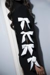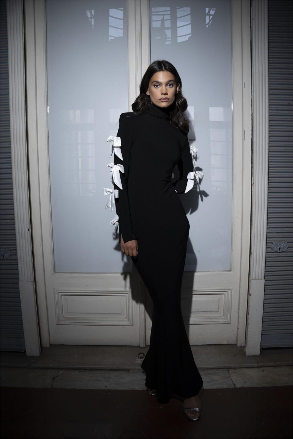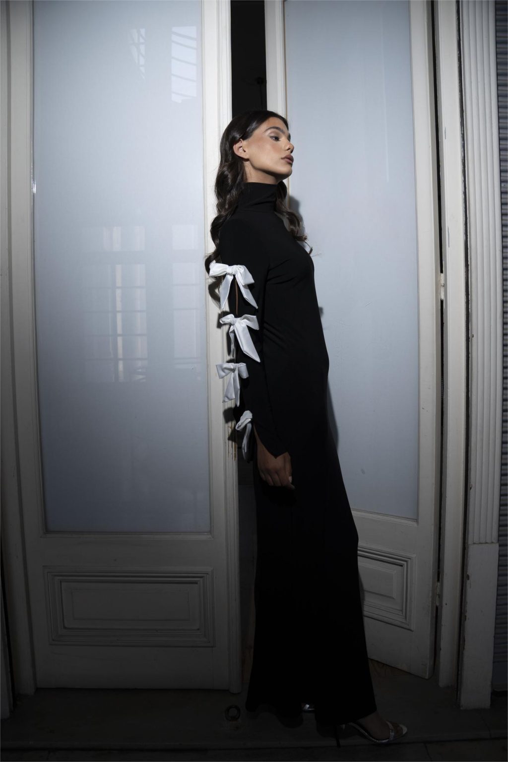 Μαύρο εφαρμοστό ζιβάγκο φόρεμα σε γοργονέ γραμμή και βάτες .Τα σκισίματα στα μανίκια με λεπτομέρειες σατέν φιόγκους, προσθέτουν μια ρομαντική πινελιά σε ένα κομψό και θηλυκό σχέδιο.