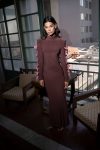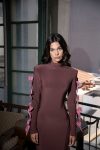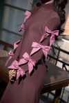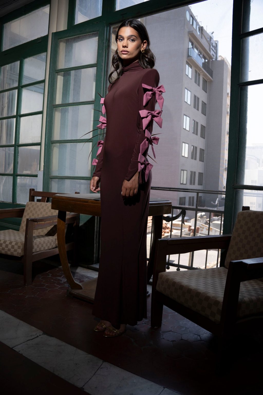Καφέ εφαρμοστό ζιβάγκο φόρεμα σε γοργονέ γραμμή και βάτες.Τα σκισίματα στα μανίκια με λεπτομέρειες ροζ φιόγκους, προσθέτουν μια ρομαντική πινελιά σε ένα κομψό και θηλυκό σχέδιο.