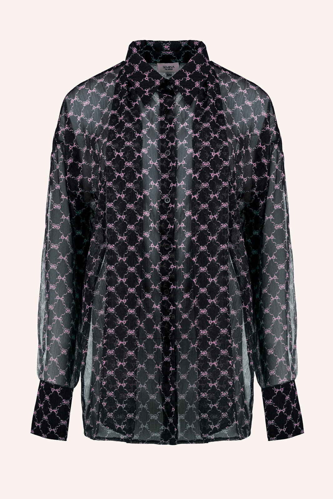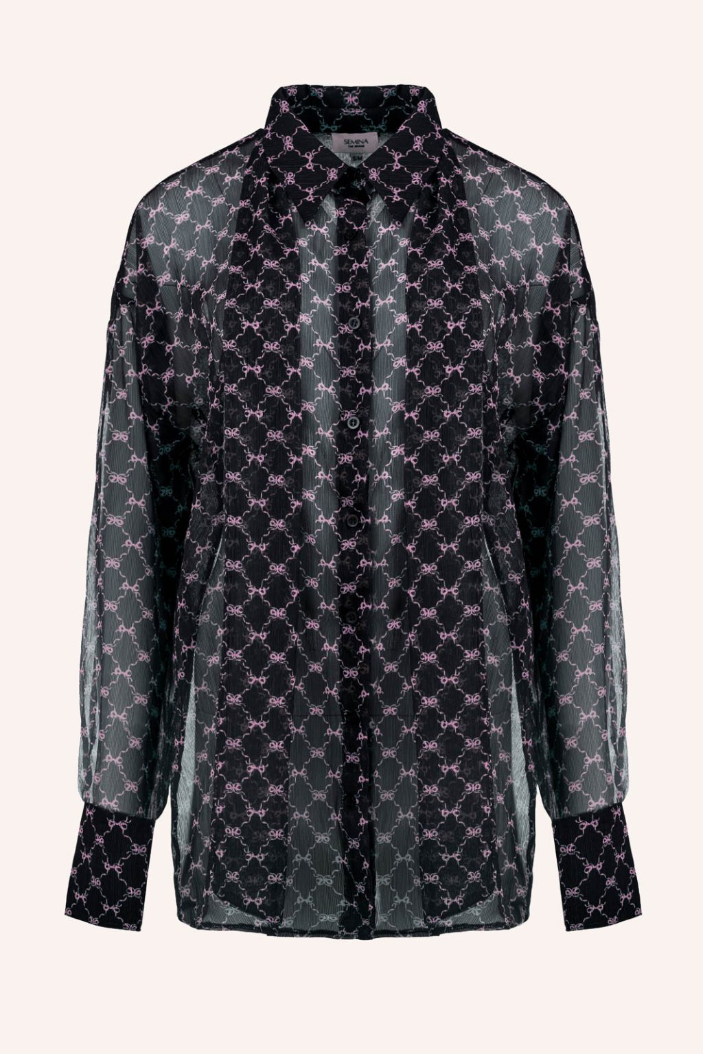 Μακρυμάνικο με χαλαρή oversized γραμμή πουκάμισο, handmade print στο signature bow τύπωμα μας σε μαύρες και ροζ αποχρώσεις. Αέρινο και ανάλαφρο για υπέροχους συνδιασμούς και άνεση όλη την ημέρα.Διαθέτει φουλάρι για να φορεθεί με διαφορετικούς τρόπους.