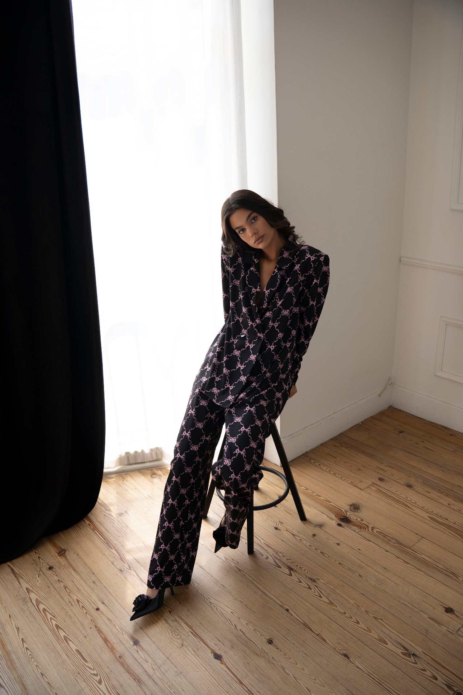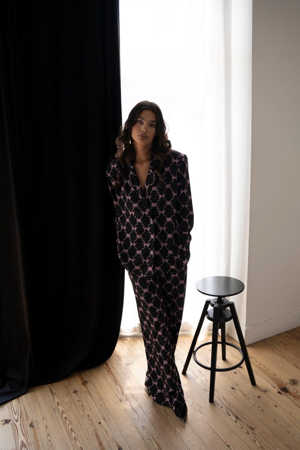Υπέροχο σετ κοστούμι με το signature bow τύπωμα μας σε μαύρες και ροζ αποχρώσεις για στυλάτες και εντυπωσιακές εμφανίσεις.Το επάνω μέρος είναι σταυροκουμπωτό και διαθέτει βάτες,ενώ το παντελόνι διεθέτει κρυφό φερμουάρ και λάστιχο στο πίσω μέρος για υπέροχη εφαρμογή.