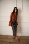 Κρουαζέ φούστα από δερματίνη, με εντυπωσιακό σχέδιο στο μπροστινό μέρος και μια υπέροχη διακοσμητική μεταλλική αγκράφα.Μπορείτε να τη συνδιάσετε εύκολα με πολλά τοπ και θα είστε καλοντυμμένη και στυλάτη όλες τις ώρες.