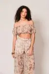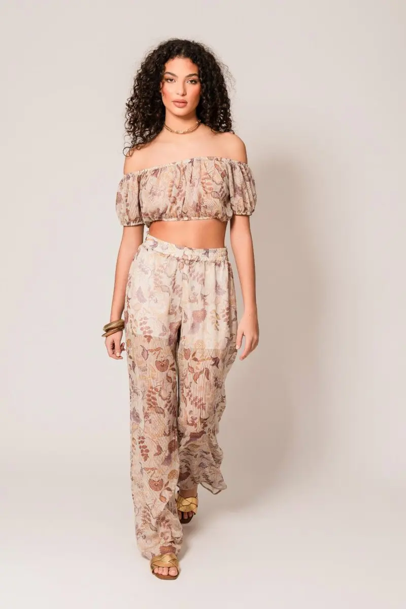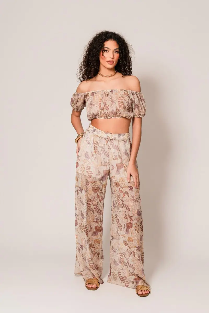 Crop top με έξω τους ώμους και balloon μανίκια, με floral print σε απαλά γήινα χρώματα. Σετ με ψηλόμεσο αέρινο παντελόνι με ημιδιάφανη ύφανση με ενσωματωμένη φόδρα στο χρώμα του δέρματος.